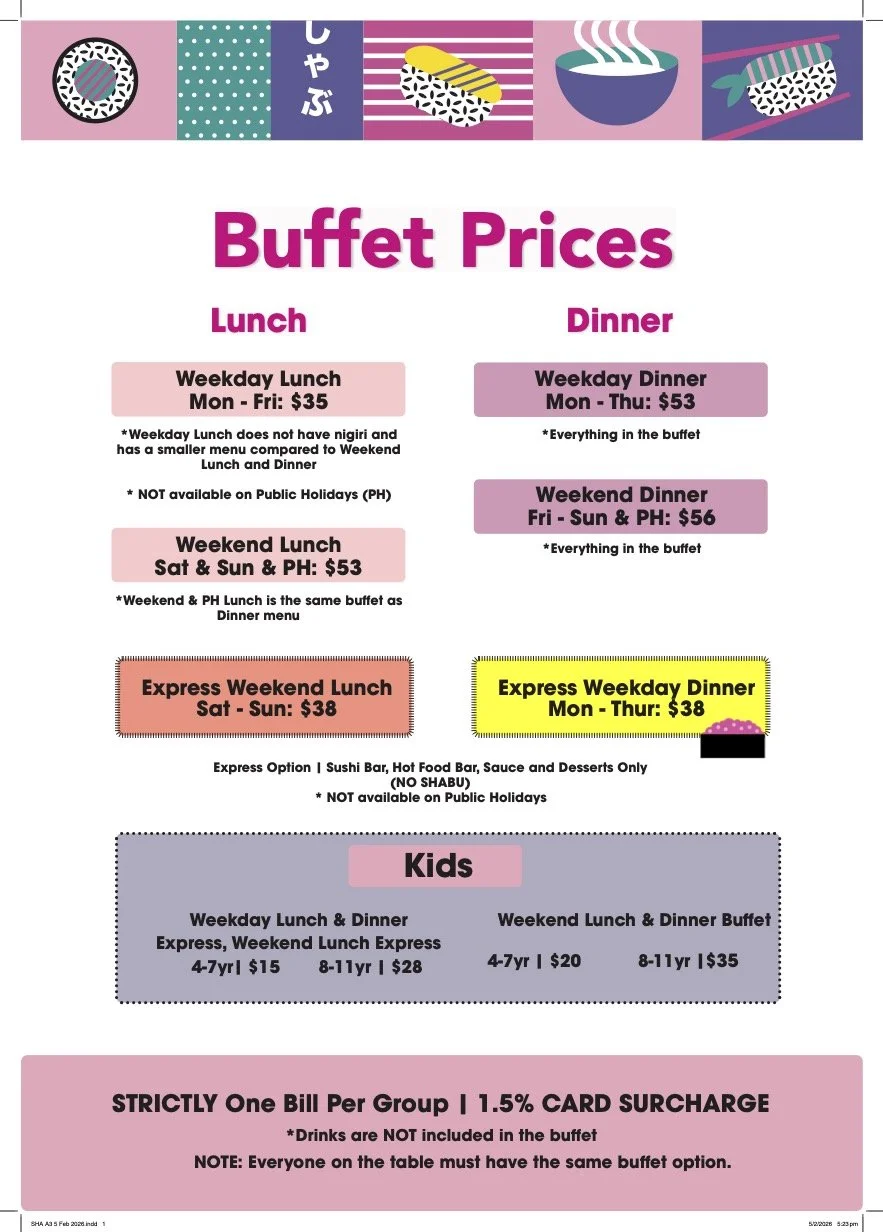 Enjoy all you can eat fresh sushi and shabu shabu with exceptional quality meats and vegetables. We hope you enjoy going nom nom on our sushi and swish swish with your noodles. Order your favourite drinks from the tablet at your table including beers, wines, sake and cocktails.